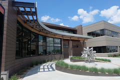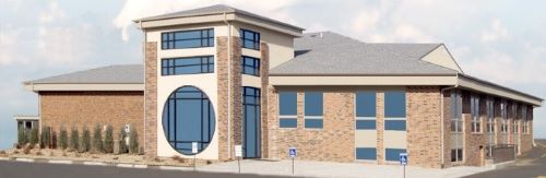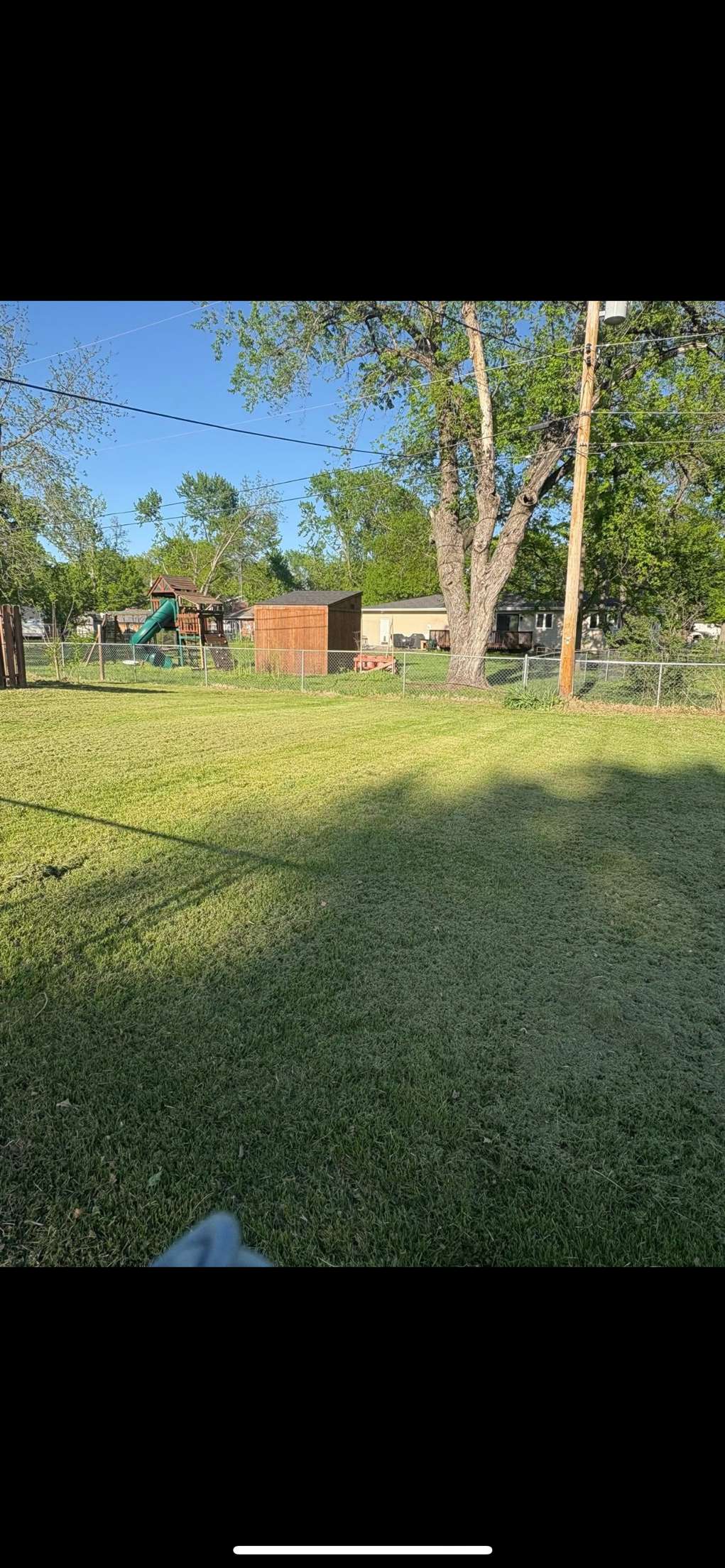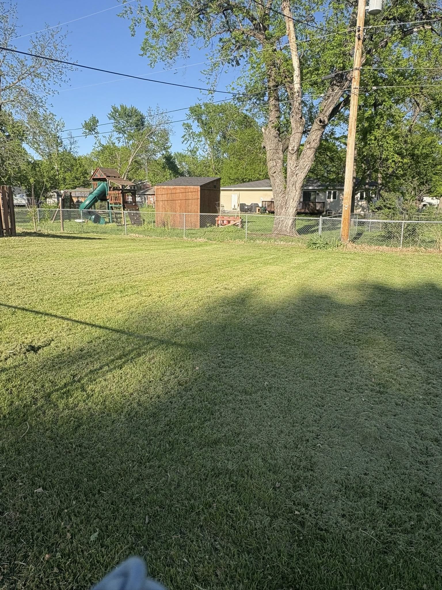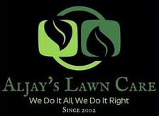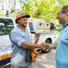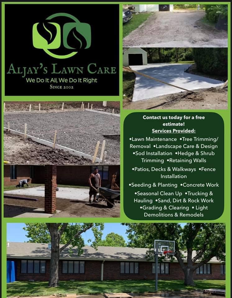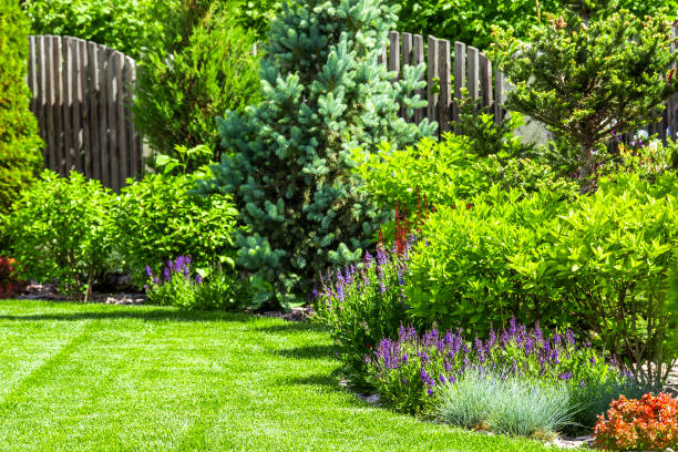- Landscape bed of garden with wave ornamental growth cypress bushes gravel mulch by color rock way on a day spring park with green lawn meadow, nobody.