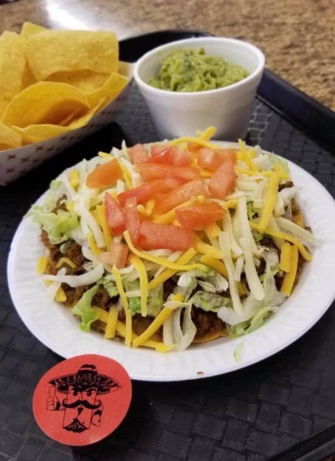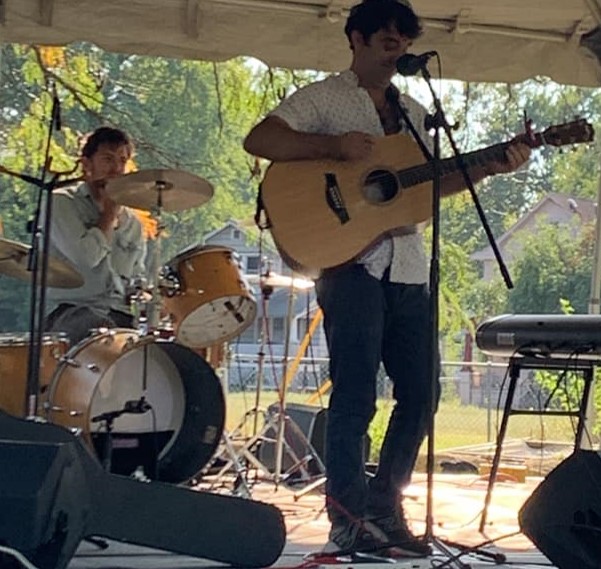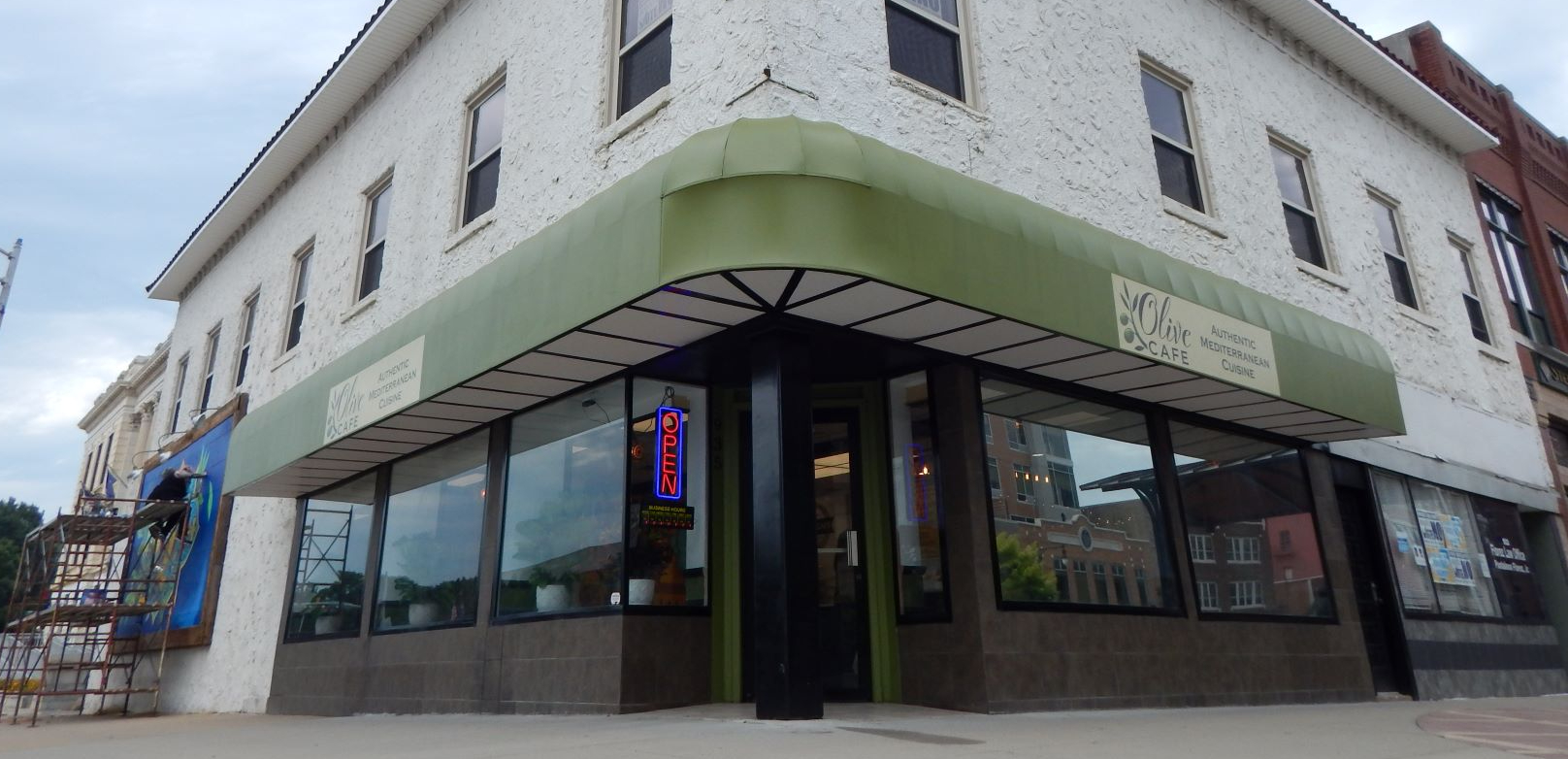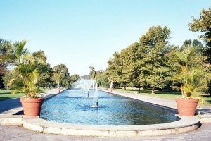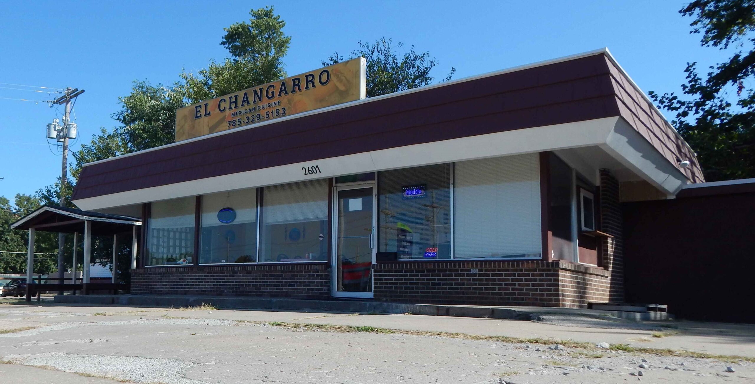 - Landscape bed of garden with wave ornamental growth cypress bushes gravel mulch by color rock way on a day spring park with green lawn meadow, nobody.